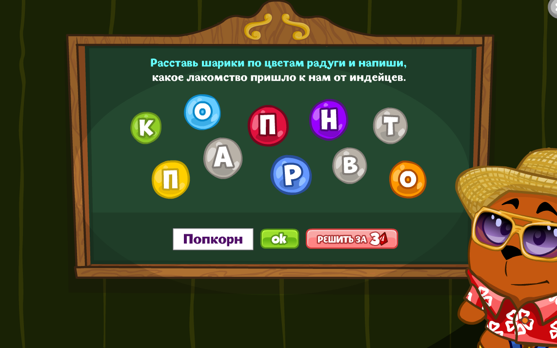 Расставь шарики по цветам радуги и напиши, какое лакомство пришло к нам от индейцев.