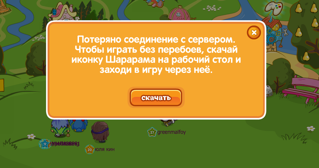 В последнее время, если вы играете через бразуер, появляется ошибка, которая гласит, что соединение с сервером потеряно. Однако после нажатия на кнопку «Скачать» мы можем спокойно продолжить играть в Шарарам через браузер и отменить скачивание лаунчера.