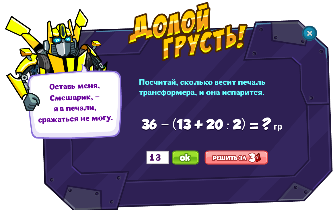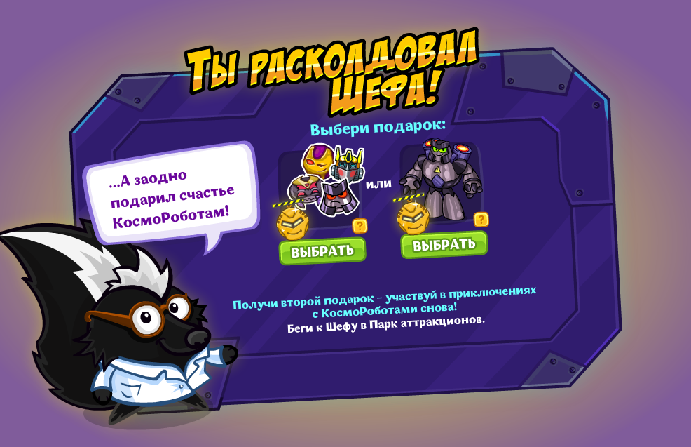 Ты прогнал плохие эмоции Трансформеров, а они вселились в Шефа! И теперь он — самый сильный Злодей мира! Расколдуй его, пока он не помог КосмоРоботам завоевать Шарарам. Получишь магию на выбор!