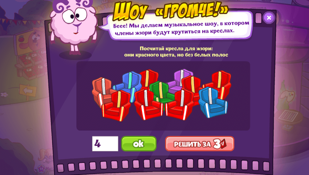 Жмём на Бараша и помогаем снять шоу «Громче!» Посчитай кресла для жюри: они красного цвета, но без белых полос.