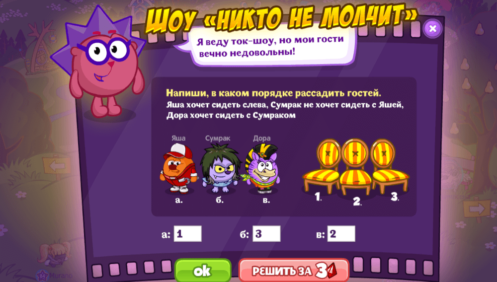 Ток-шоу «Никто не молчит» вместе с Ёжиком. Напиши, в каком порядке рассадить гостей.
