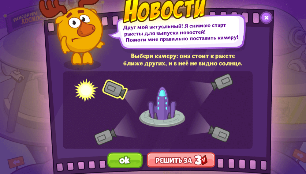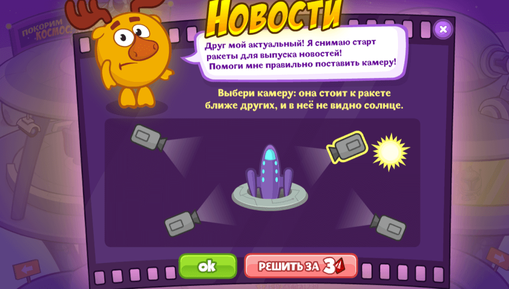 Здесь нас ждёт Лосяш. Поможем выбрать камеру: она стоит к ракете ближе других, и в неё не видно солнце.