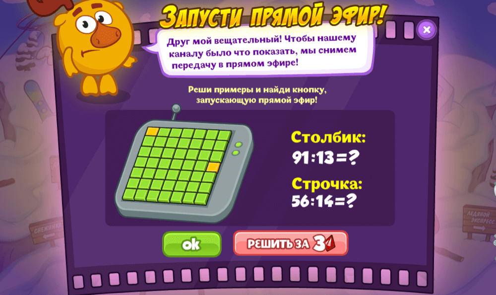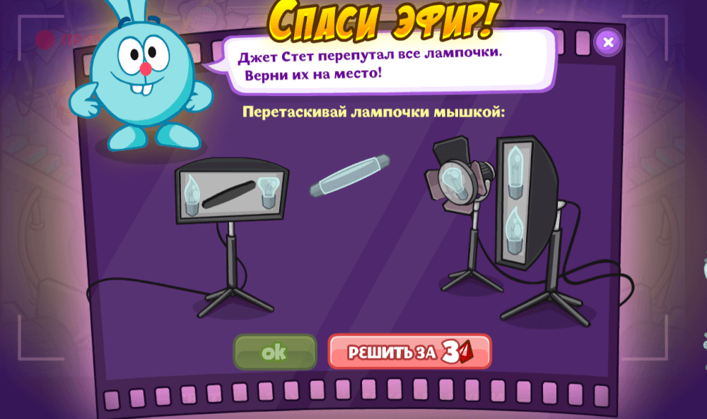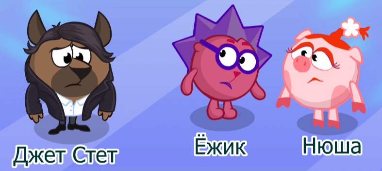 После разговора с Нюшей, мы получаем задание найти всех Смешариков-ведущих и заполнить программу передач. Так вперёд!