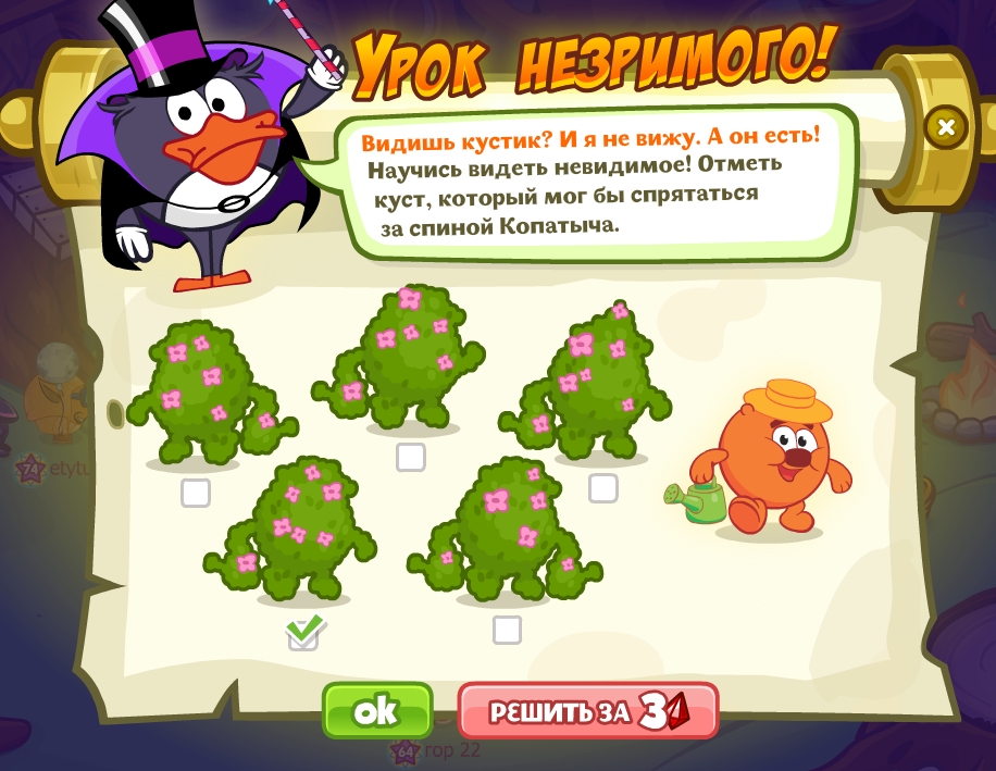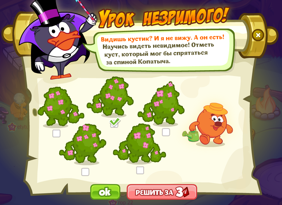 Видишь кустик? И я не вижу! А он есть! Научись видеть невидимое! Отметь куст, который мог бы спрятаться за спиной Копатыча.