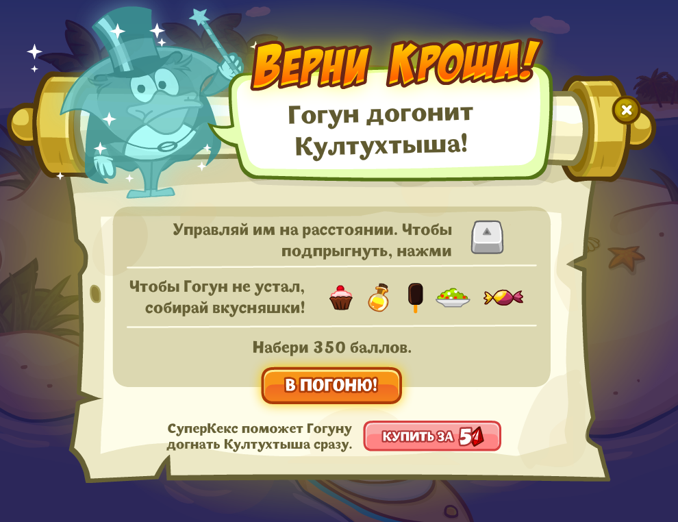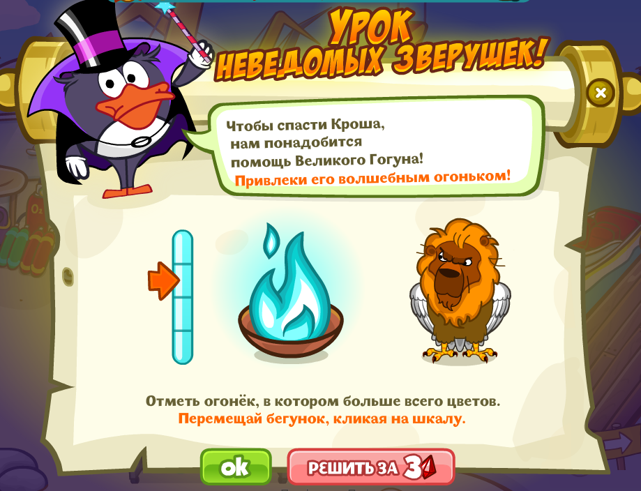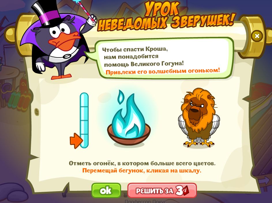 Чтобы спасти Кроша, нам понадобится помощь Великого Гогуна! Привлеки его волшебным огоньком!