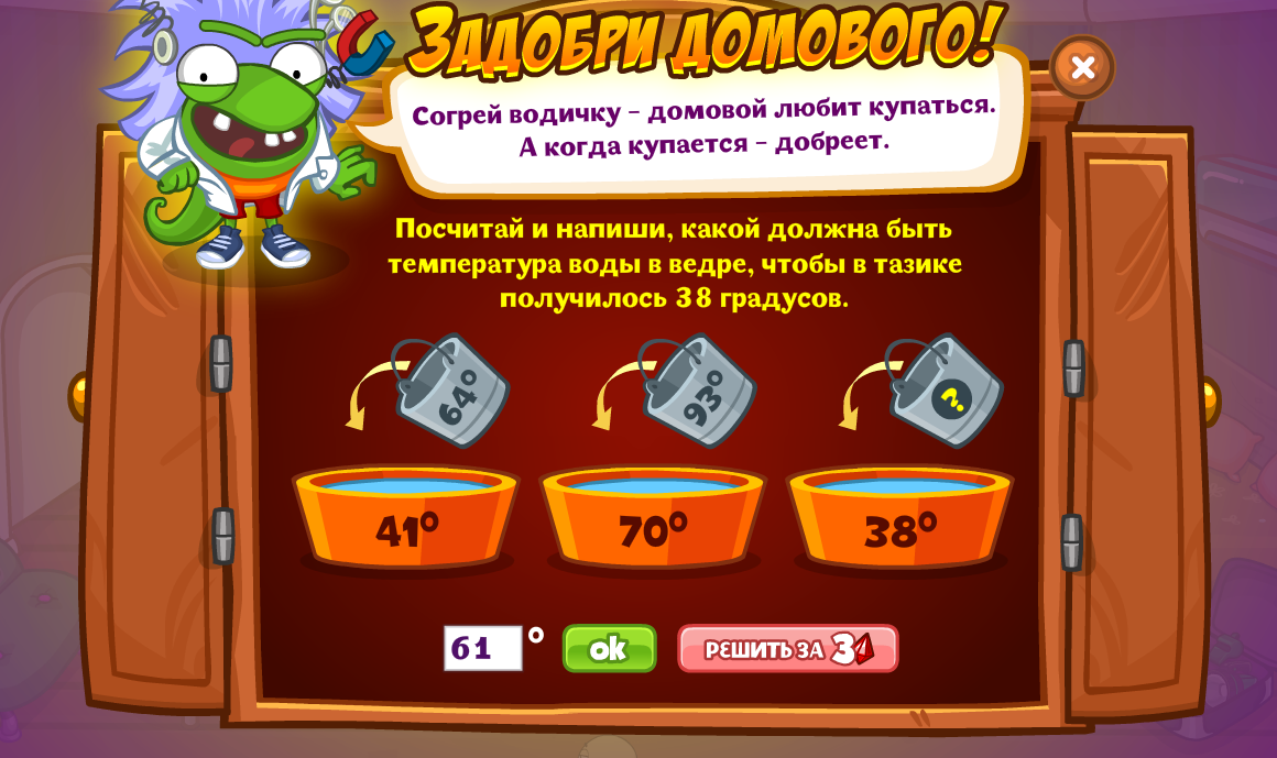 Посчитай и напиши, какой должна быть температура воды в ведре, чтобы в затике получилось 38 градусов.