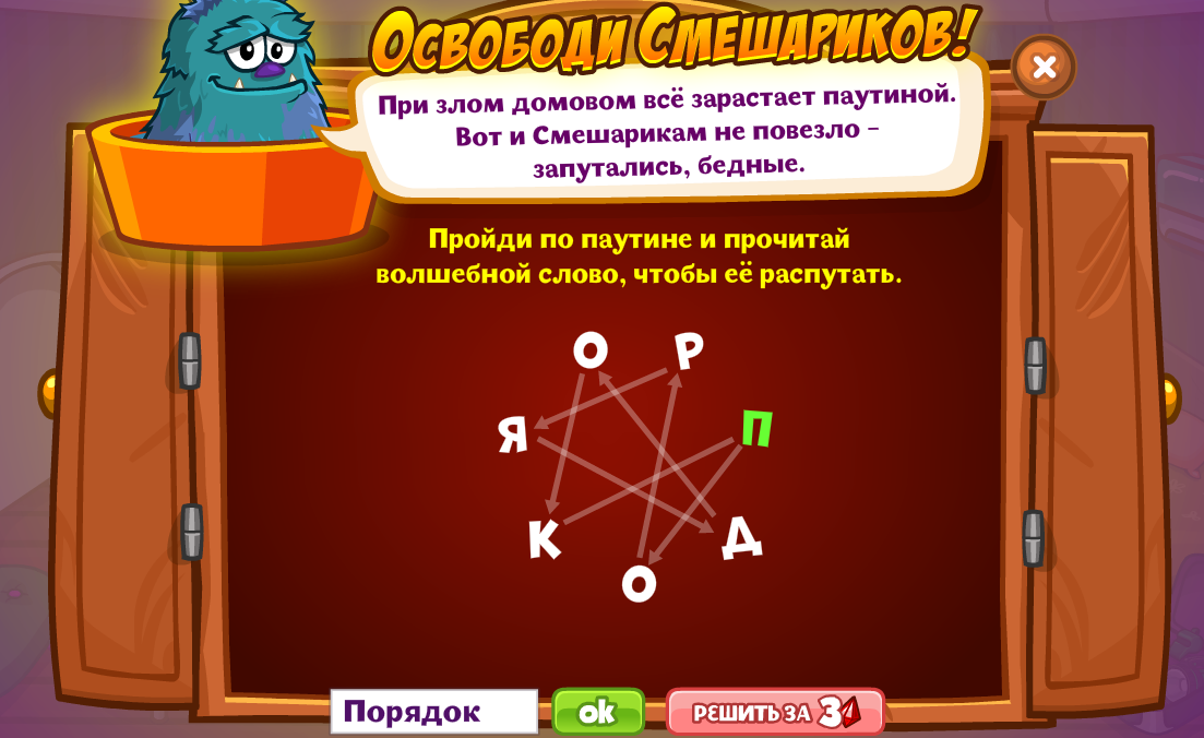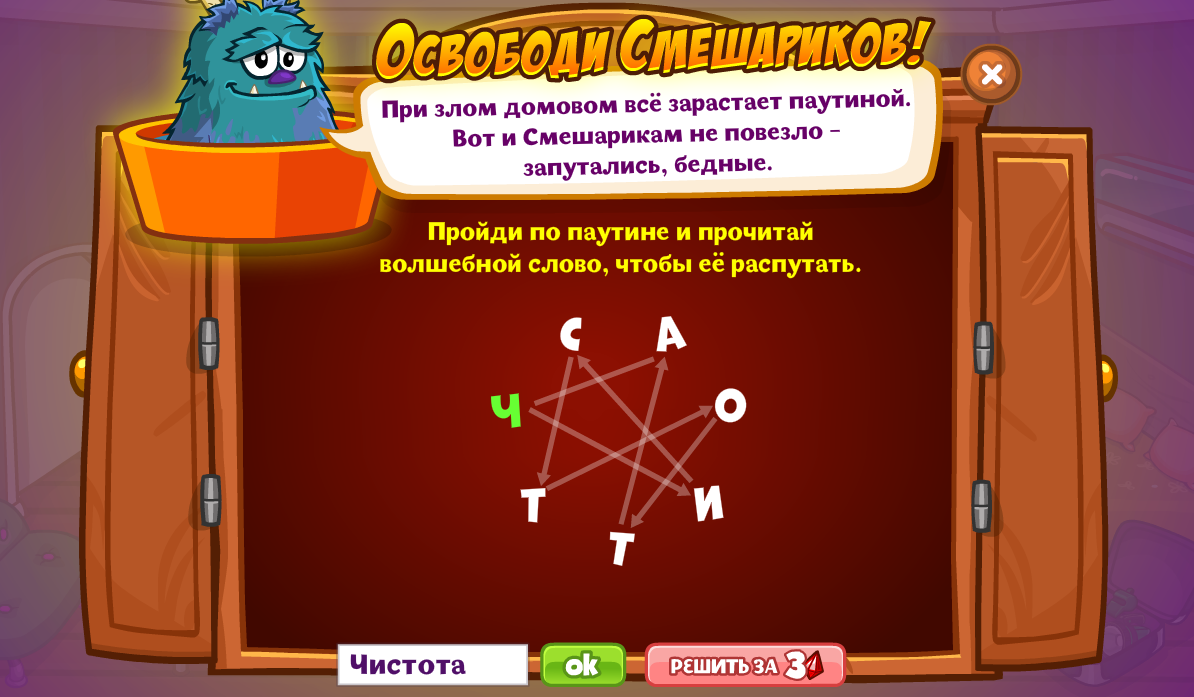 Пройди по паутине и прочитай волшебное слово, чтобы её распутать.