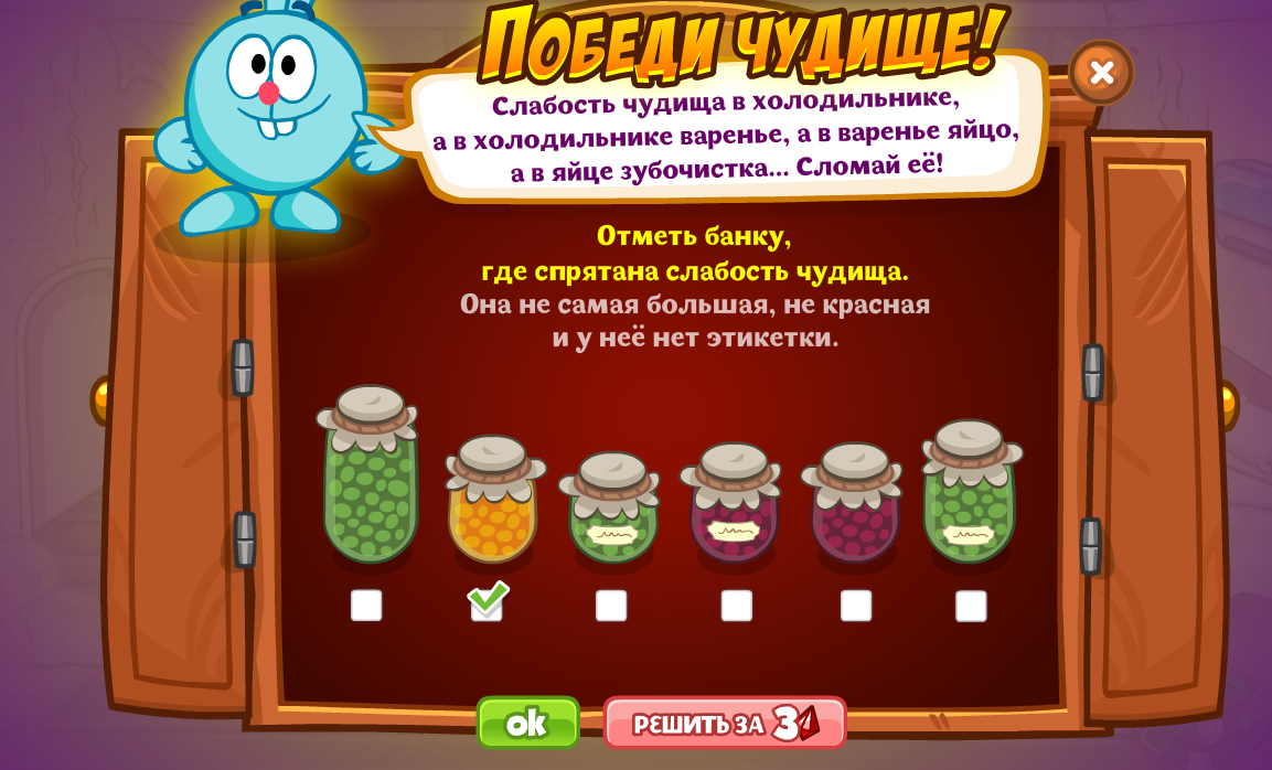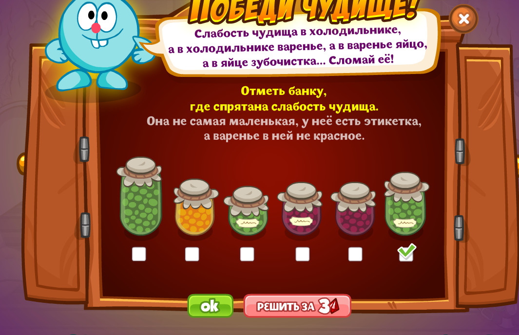 Отметь банку, где спрятана слабость чудища. Она не самая маленькая, у неё есть этикетка, а варенье в ней не красное.
