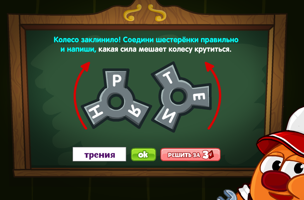 Колесо заклинило! Соедини шестерёнки правильно и напиши, какая сила мешает колесу крутиться.