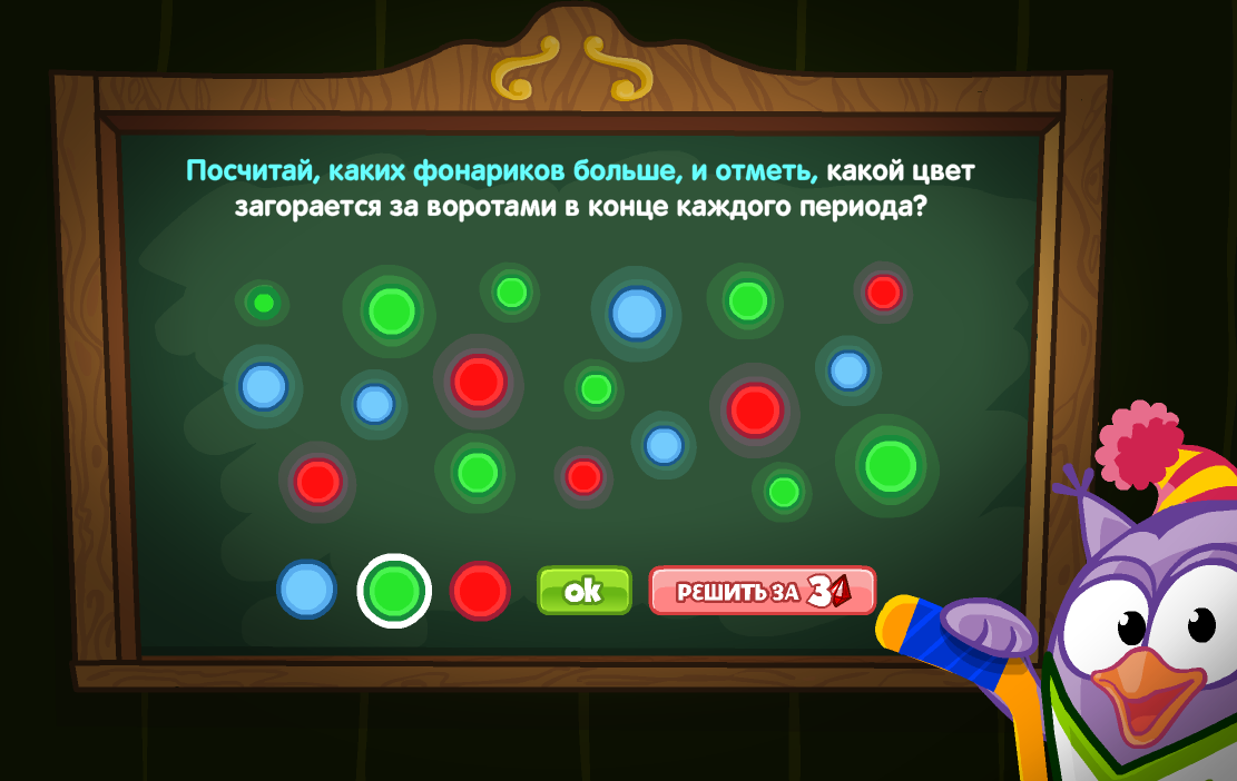 Посчитай, каких фонариков больше, и отметь, какой цвет загорается за воротами в конце каждого периода?