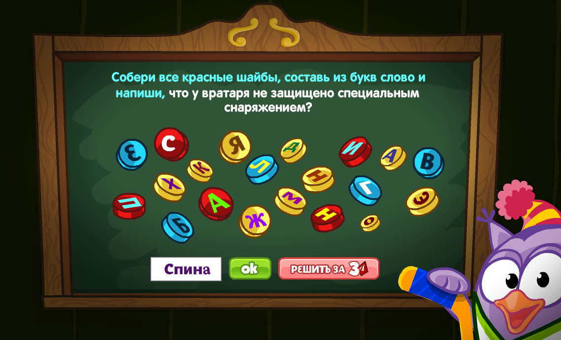 Собери все красные шайбы, составь из букв слово и напиши, что у вратаря не защищено специальным снаряжением