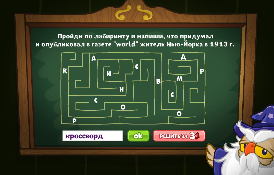 Пройди по лабиринту и напиши, что придумал и опубликовал в газете «world» житель Нью-Йорка в 1913 г.