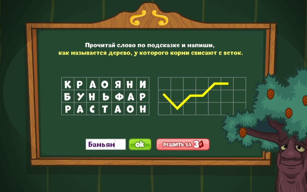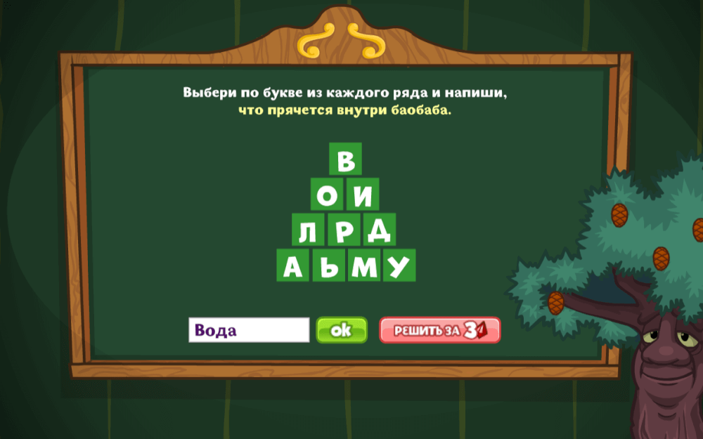 Выбери по букве из каждого ряда и напиши, что прячется внутри баобаба.