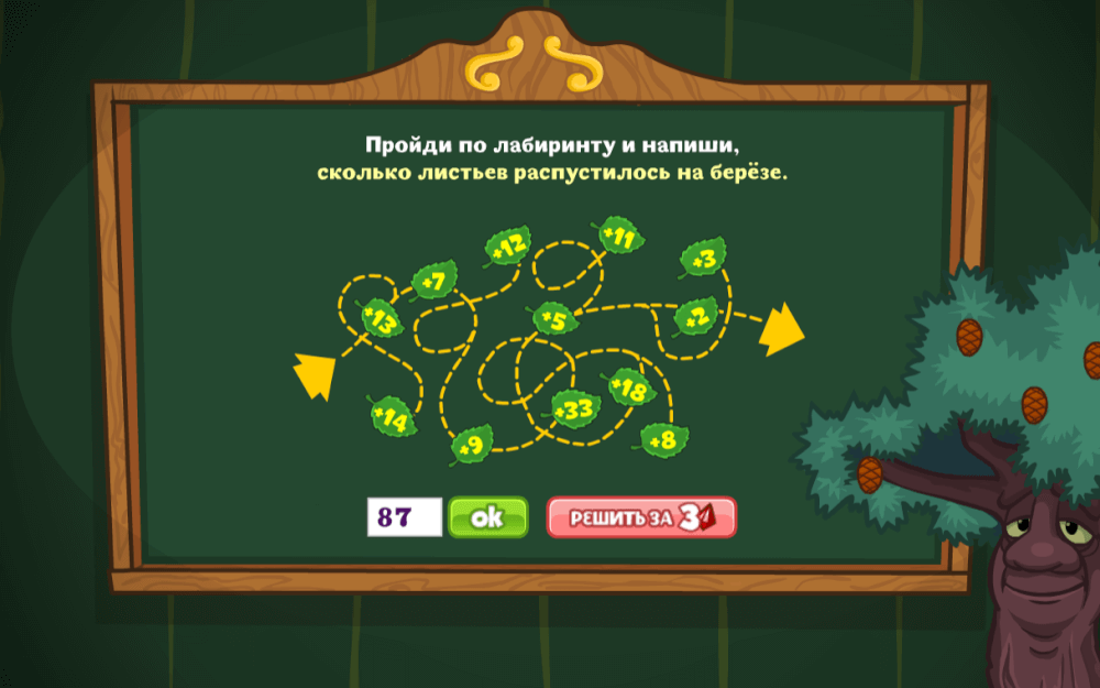 Пройди по лабиринту и напиши, сколько листьев распустилось на берёзе.
