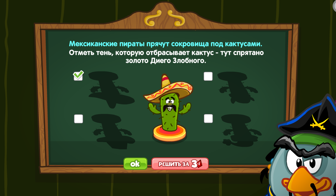 Мексиканские пираты прячут сокровища под кактусами. Отметь тень, которую отбрасывает кактус — тут спрятано золото Диего Злобного.