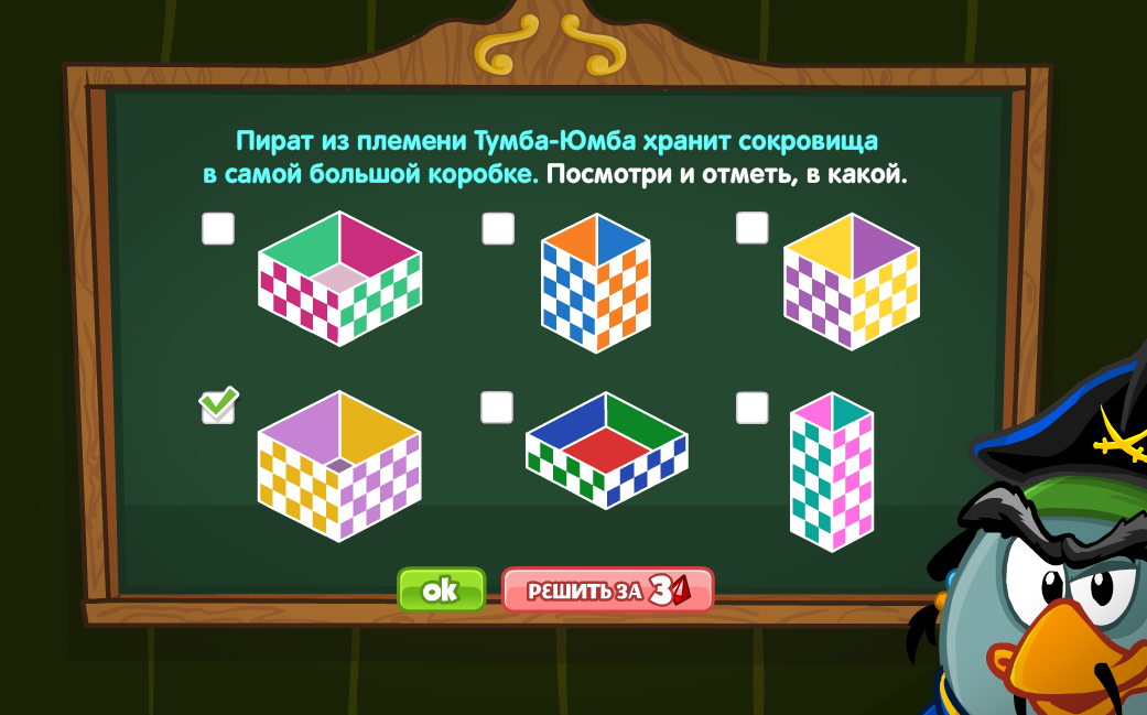 Пират из племени Тумба-Юмба хранит сокровища в самой большой коробке. Посмотри и отметь, в какой.