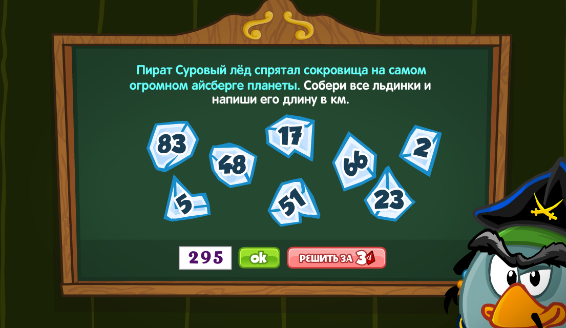 Пират Суровый лёд спрятал сокровища на самом огромном айсберге планеты. Собери все льдинки и напиши его длину в км.