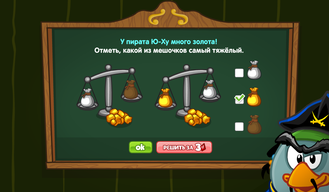 У пирата Ю-Ху много золота! Отметь, какой из мешочков самый тяжёлый.