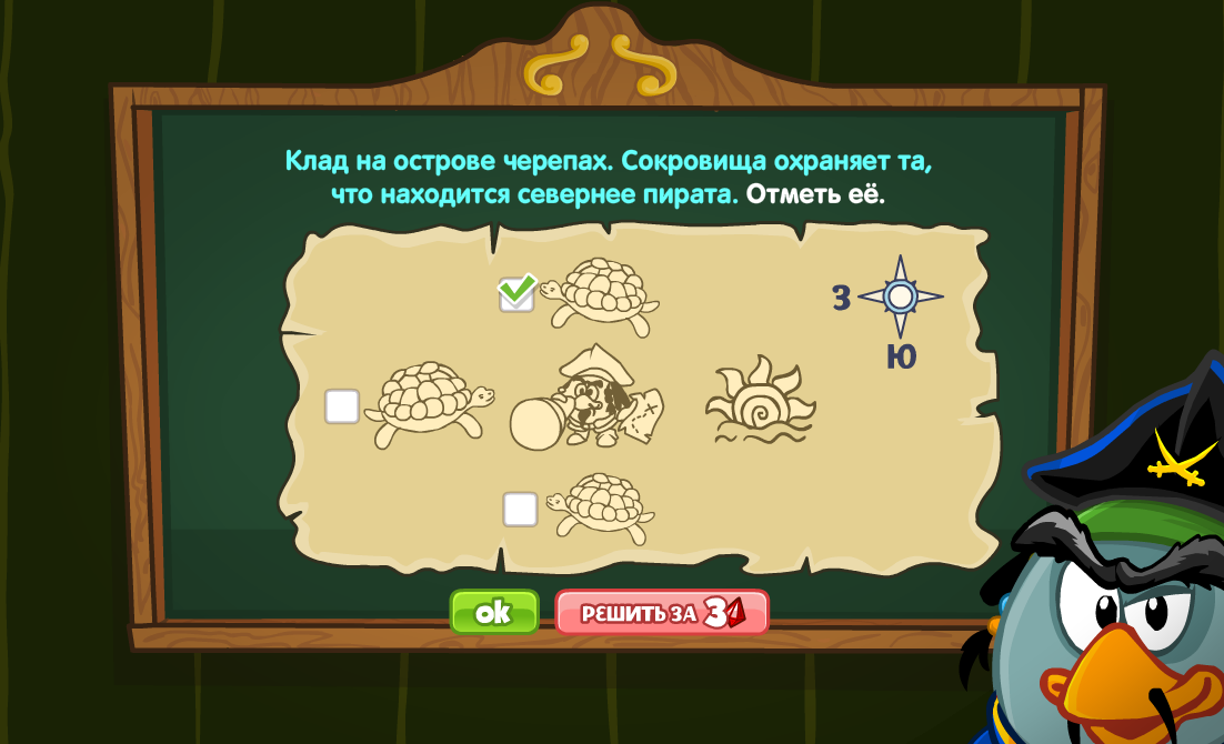 Клад на острове черепах. Сокровища охраняет та, что находится севернее пирата. Отметь её.