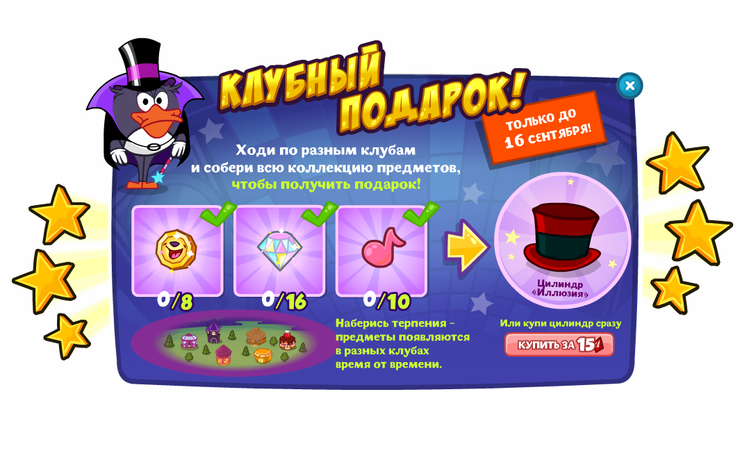 Ходи по разным клубам, чтобы собрать коллекцию предметов, и получи за это в подарок цилиндр «Иллюзия»