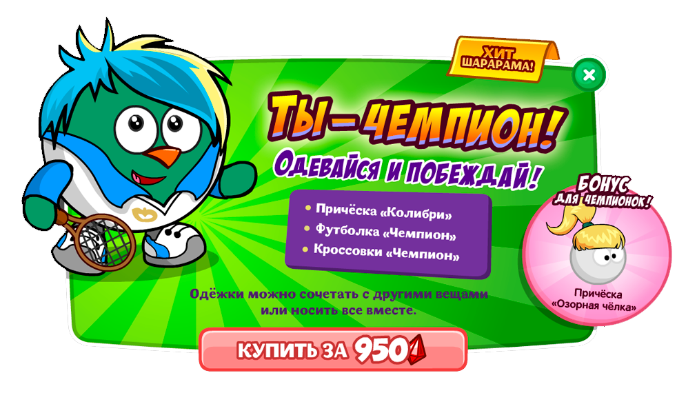 Повтор акции «Хит Шарарама» под названием «Ты — чемпион!» За 950 румбиков вы получите причёску и футболку «Колибри», кроссовки «Чемпион и причёску «Озорная чёлка».