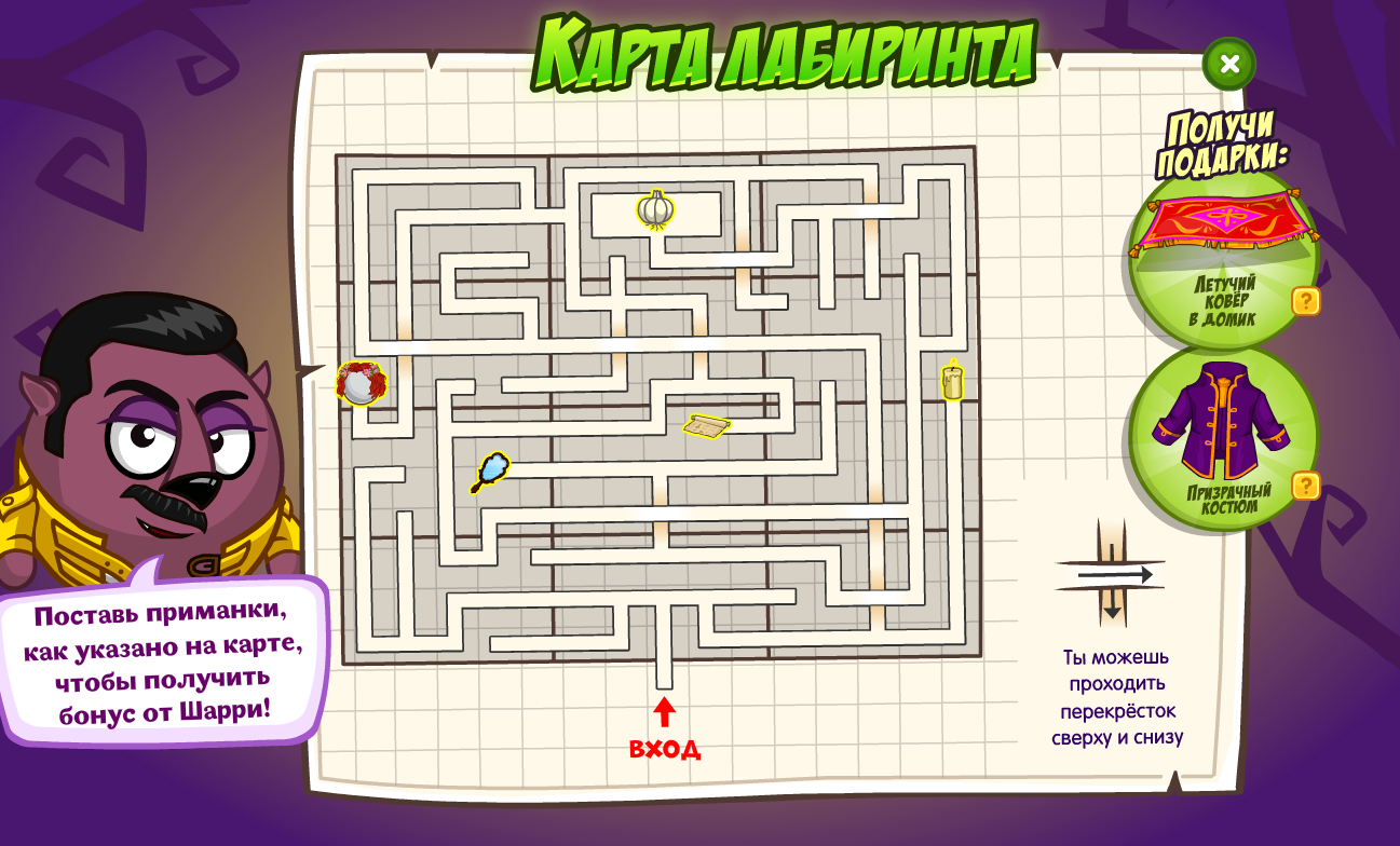 Стартовало событие под названием «Охота за нечистью». В рамках данного ивента вам нужно бродить по лабиринту и расставлять правильные ловушки, чтобы ловить нечисть. Карта лабиринта и то, какие ловушки куда нужно выкладывать, представлена сверху.