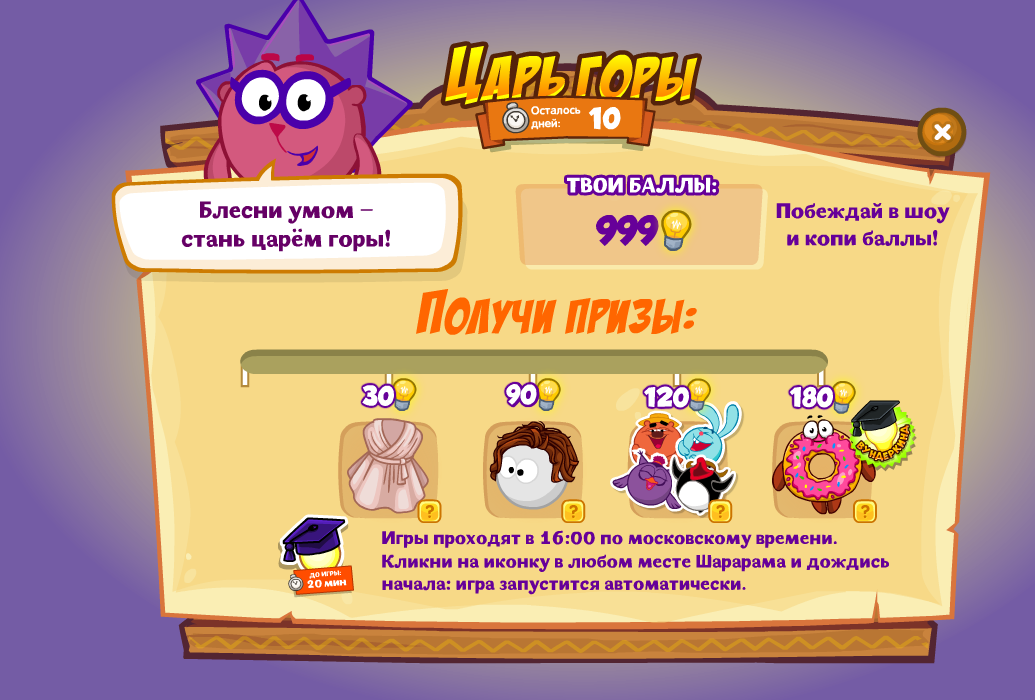 Третья игра — аналог Царя горы. Отвечая правильно на вопросы, вы получаете баллы, которые потом конвертируются в смешинки.