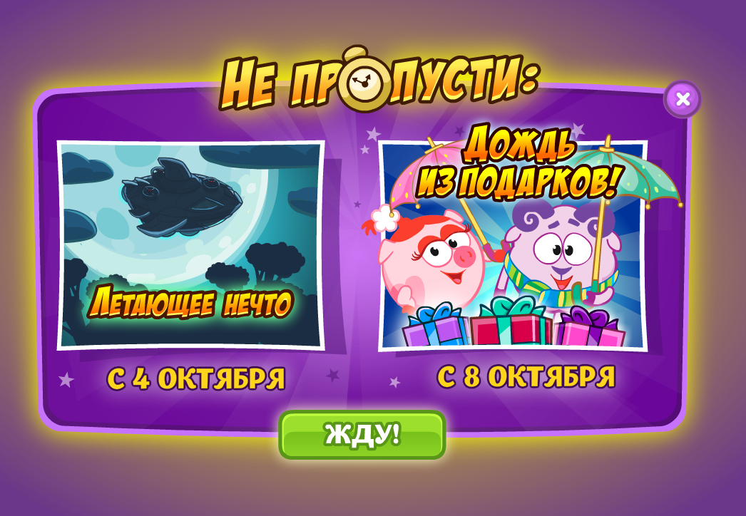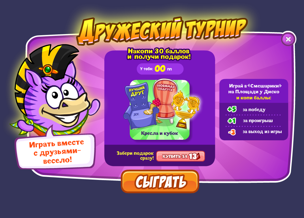 Участвуй в празднике дружбы! Для этого играй в Смешарики на Площади перед Диско и зарабатывай баллы. Наберёшь 30 баллов — получишь в подарок кресла и кубок!