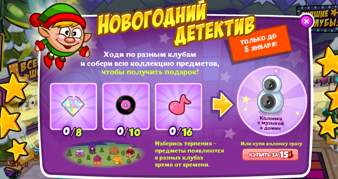 Собери определенное количество предметов в клубе и получи в подарок «Колонку с музыкой» в домик. Акция продлится до 5 января.