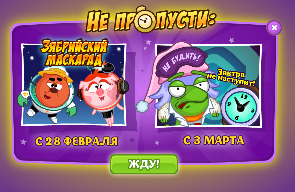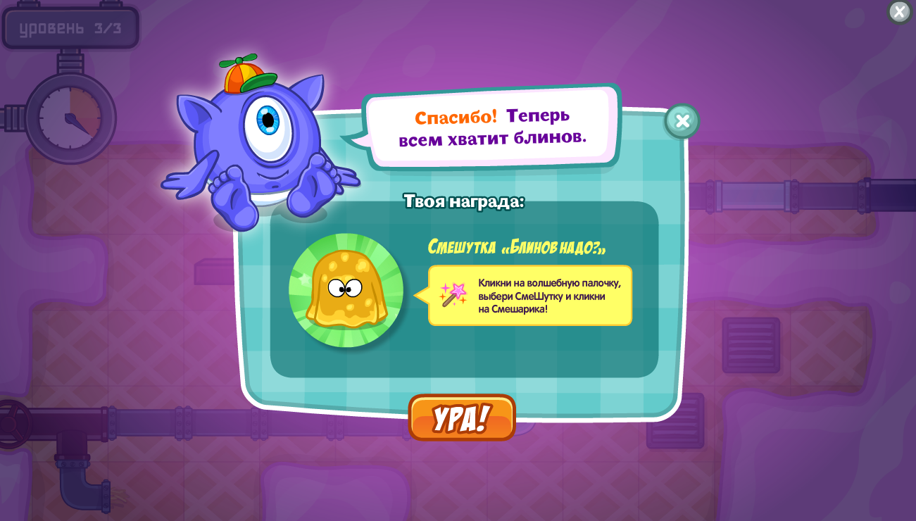 Пройди три уровня игры «Почини трубопровод» и получи в подарок СмеШутку «Блинов надо?». Подарок доступен к получению для всех Смешариков.