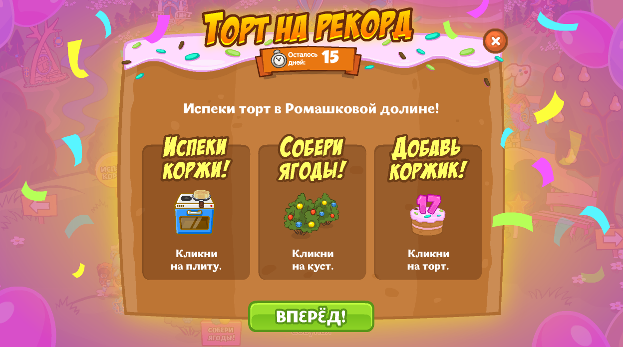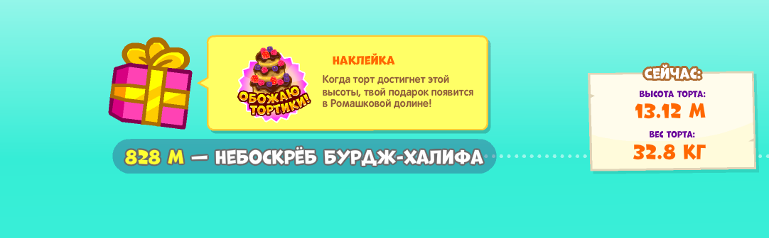 Ещё в рамках праздника вы можете поучаствовать в выпекании самого большого торта: достаточно нажать на него и выбрать корж. Сделать это можно только один раз. Как только торт достигнет размера 828м, вы получите в подарок наклейку «Обожаю тортики»