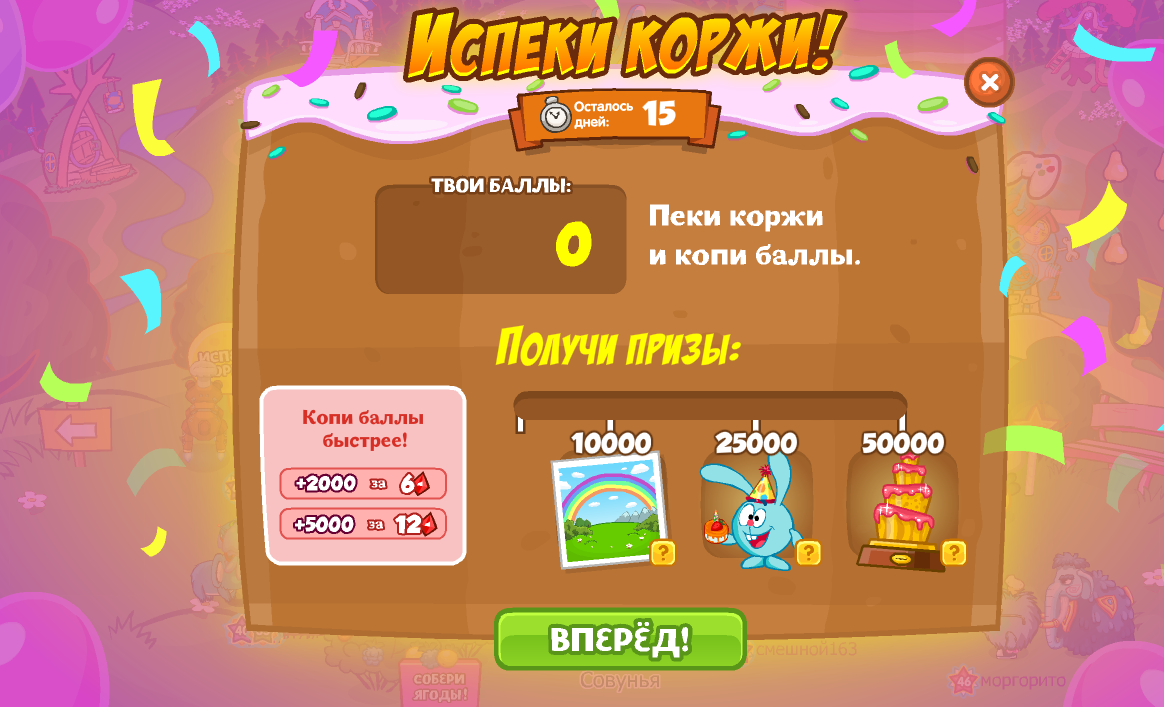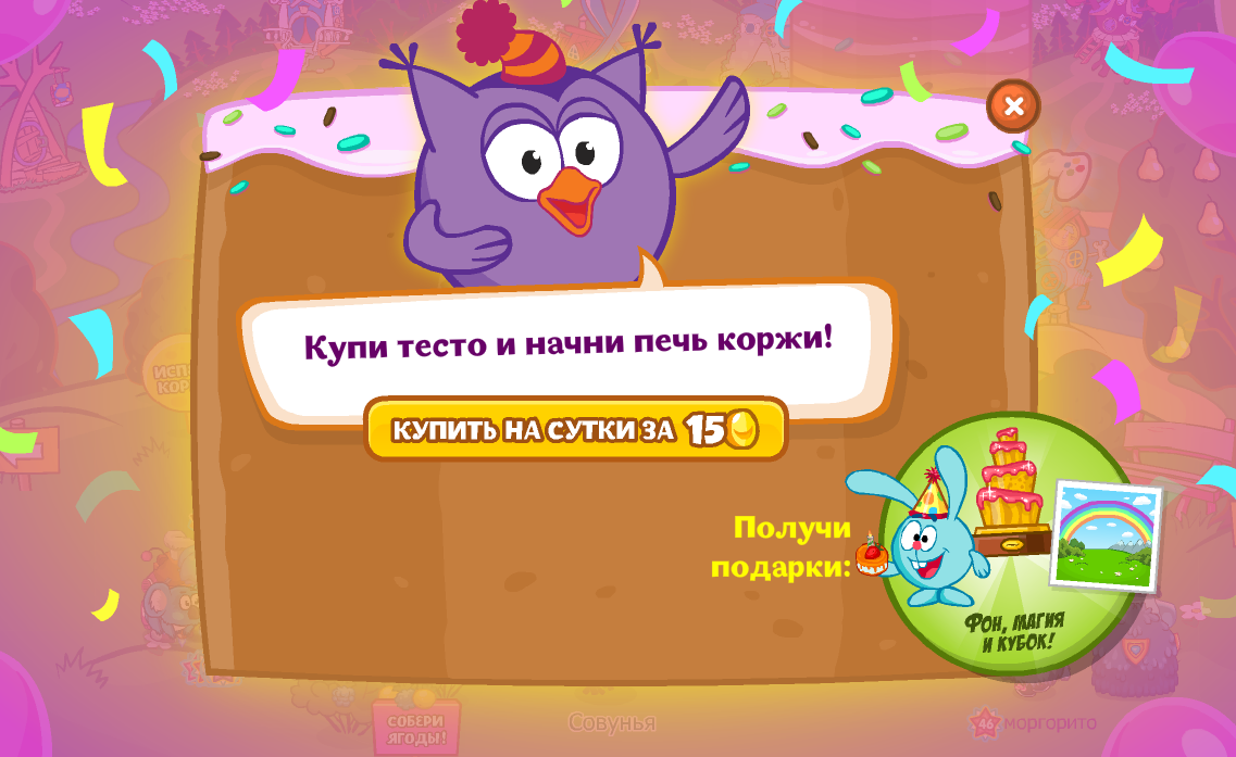 Ура, Смешарикам исполнилось 17 лет! В честь этого Совунья предлагает нам испечь настолько большой торт, насколько это возможно. Делать это мы будем с помощью участия в турнирах по мини-играм.
