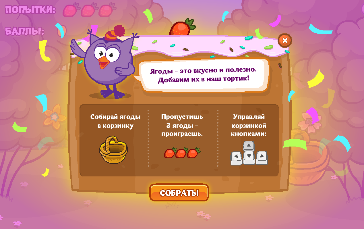Другая игра доступна всем Смешарикам. Здесь нам необходимо собирать ягоды ( по аналогии с игрой из Египта, где мы собираем финики).