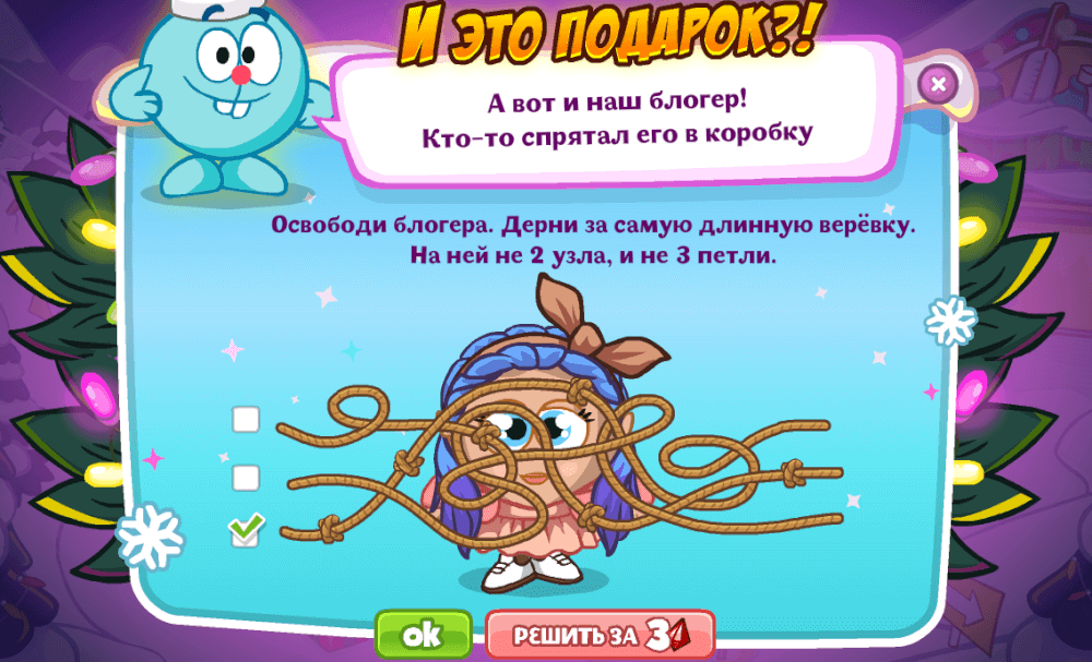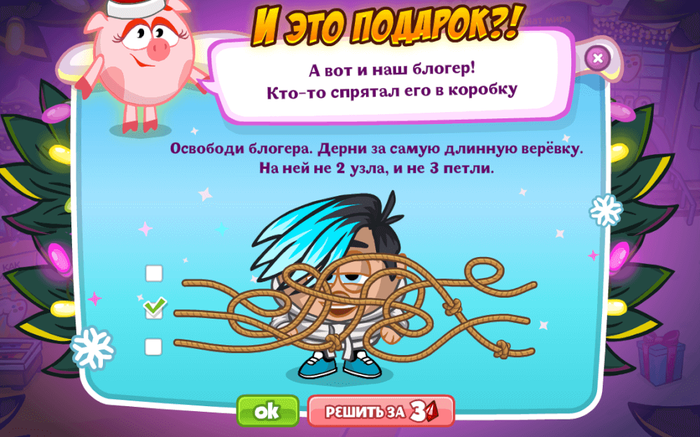 Освободи блогера. Дерни за самую длинную верёвку. На ней не 2 узла, и не 3 петли.