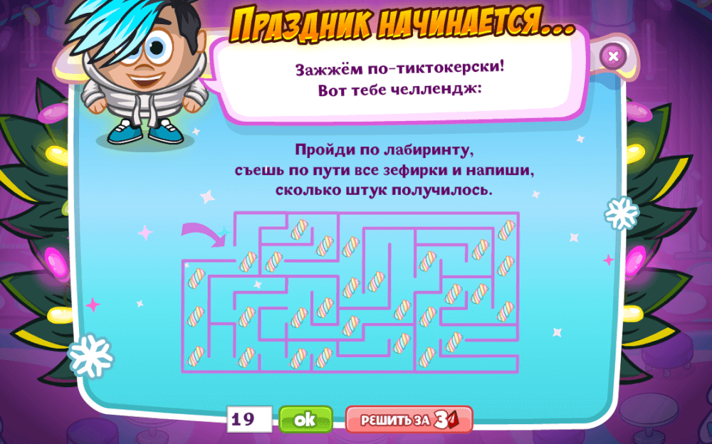 Пройди по лабиринту и съешь по пути все зефирки и напиши, сколько штук получилось
