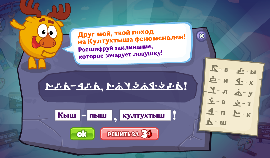 Вижу, ты решил поймать грозного Култухтыша! Давай сделаем волшебную ракушку-ловушку. Нам нужны перья перелётных птиц,заклинание и сама ракушка. Смешарики в Шарараме помогут тебе их найти! Когда будешь готов, возвращайся ко мне, и мы зачаруем ракушку-ловушку!