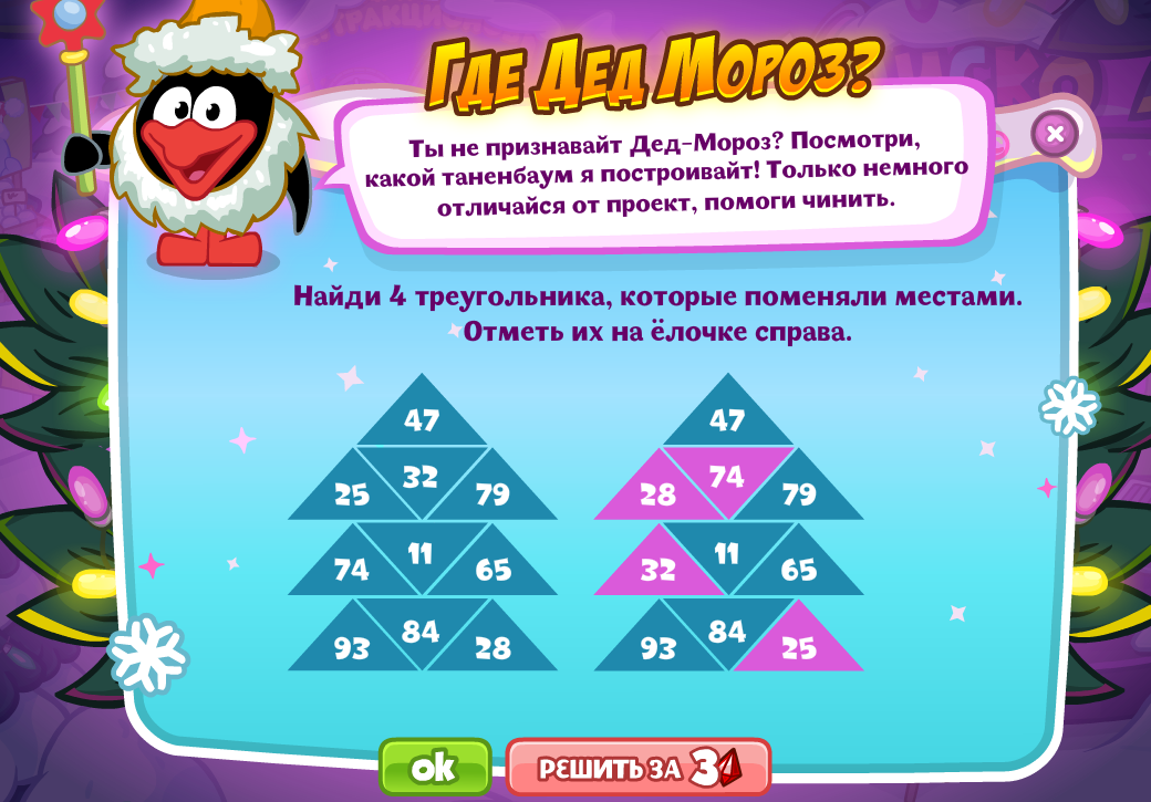 Найди 4 треугольника, которые поменяли местами. Отметь их на ёлочке справа.