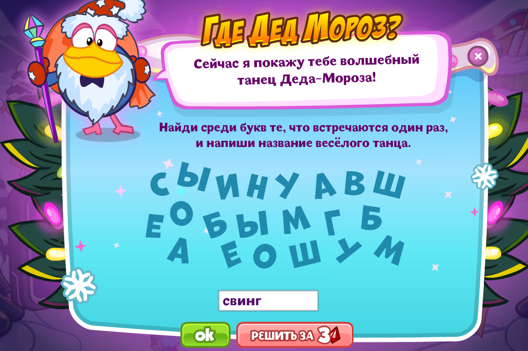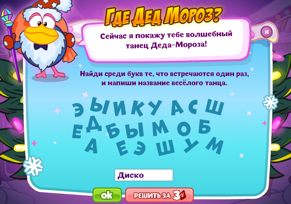 Сейчас я покажу тебе волшебный танец Деда-Мороза! Найди среди букв те, что встречаются один раз и напиши название весёлого танца.