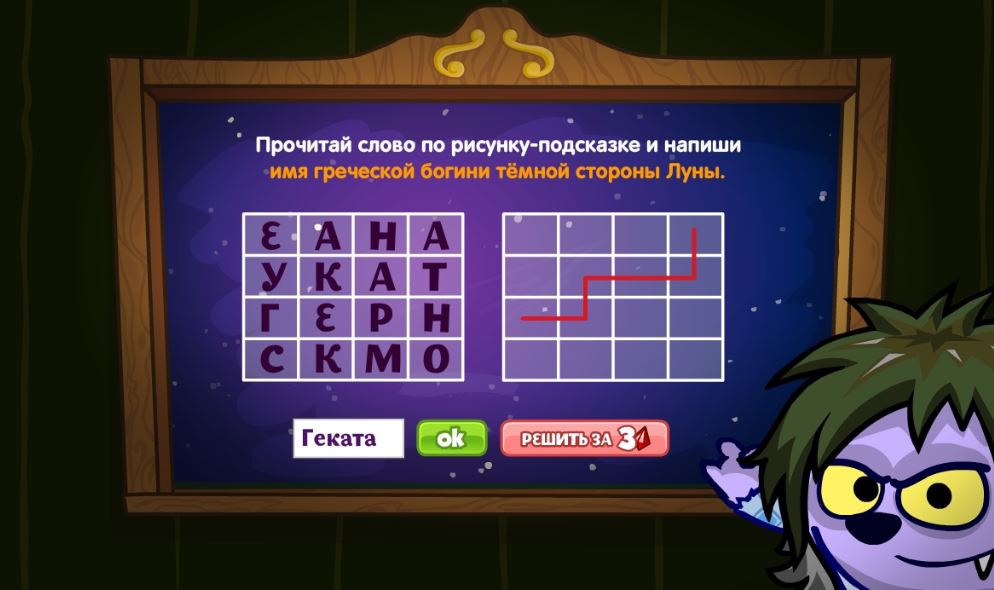 Прочитай слово по рисунку-подсказке и напиши имя греческой богини тёмной стороны Луны.