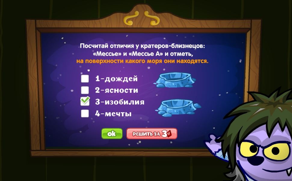 Посчитай отличия у кратеров-близнецов: «Мессье» и «Мессье А» и отметь, на поверхности какого моря они находятся.
