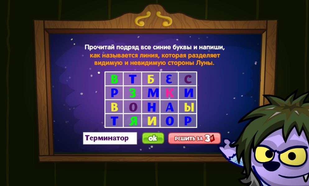 Посчитай подряд все синие буквы и напиши, как называется линия, которая разделяет видимую и невидимую стороны Луны.