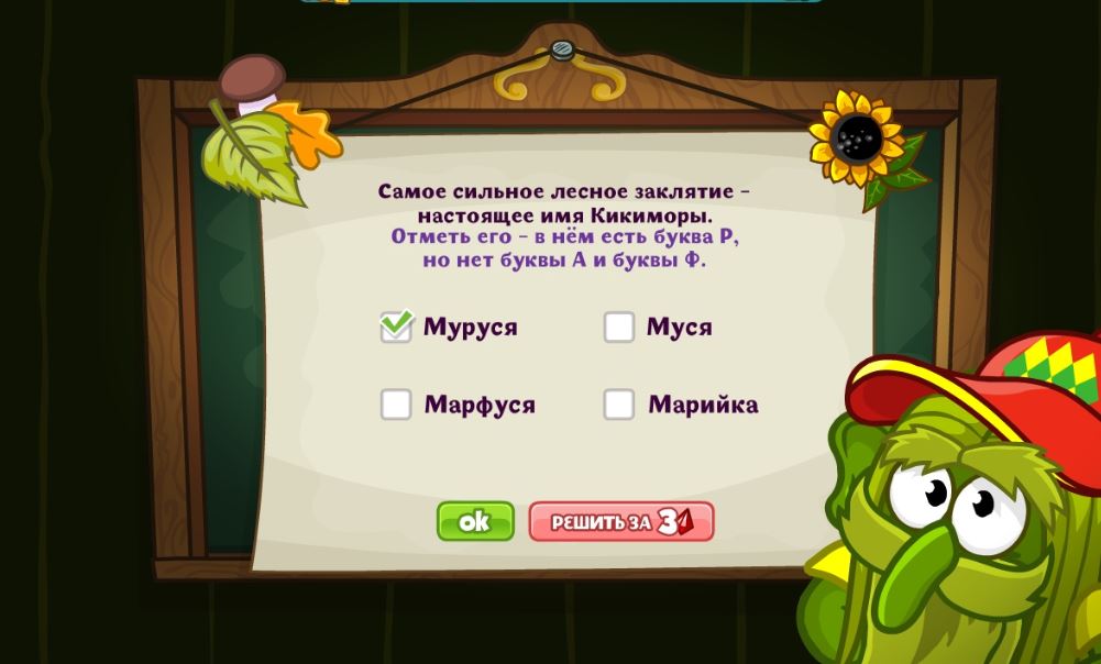 Самое сильное лесное заклятие — настоящее имя Кикиморы. Отметь его — в нём есть буква Р, но нет буквы А и буквы Ф.
