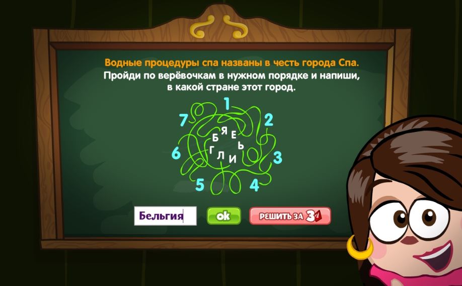 Водные процедуры спа названы в честь города Спа. Пройди по верёвочкам в нужном порядке и напиши, в какой стране этот город.