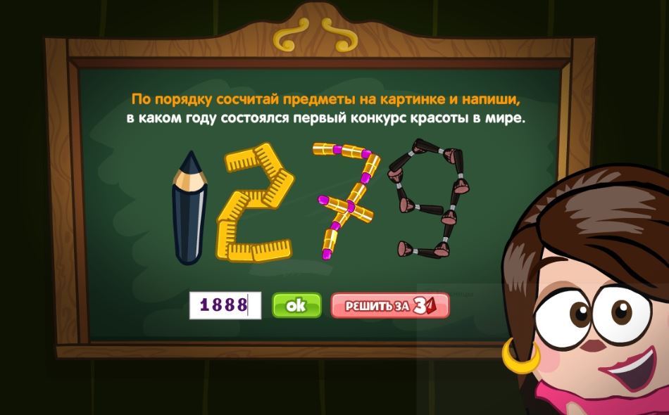 По порядку сосчитай предметы на картинке и напиши, в каком году состоялся первый конкурс красоты в мире.