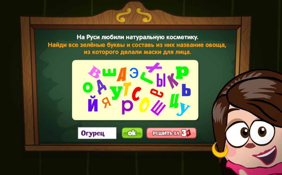 На Руси любили натуральную косметику. Найди все зелёные буквы и составь из них название овоща, из которого делали маски для лица.