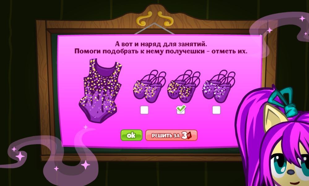 А вот и мой наряд для выступления. Помоги подобрать к нему получешки — отметь их.