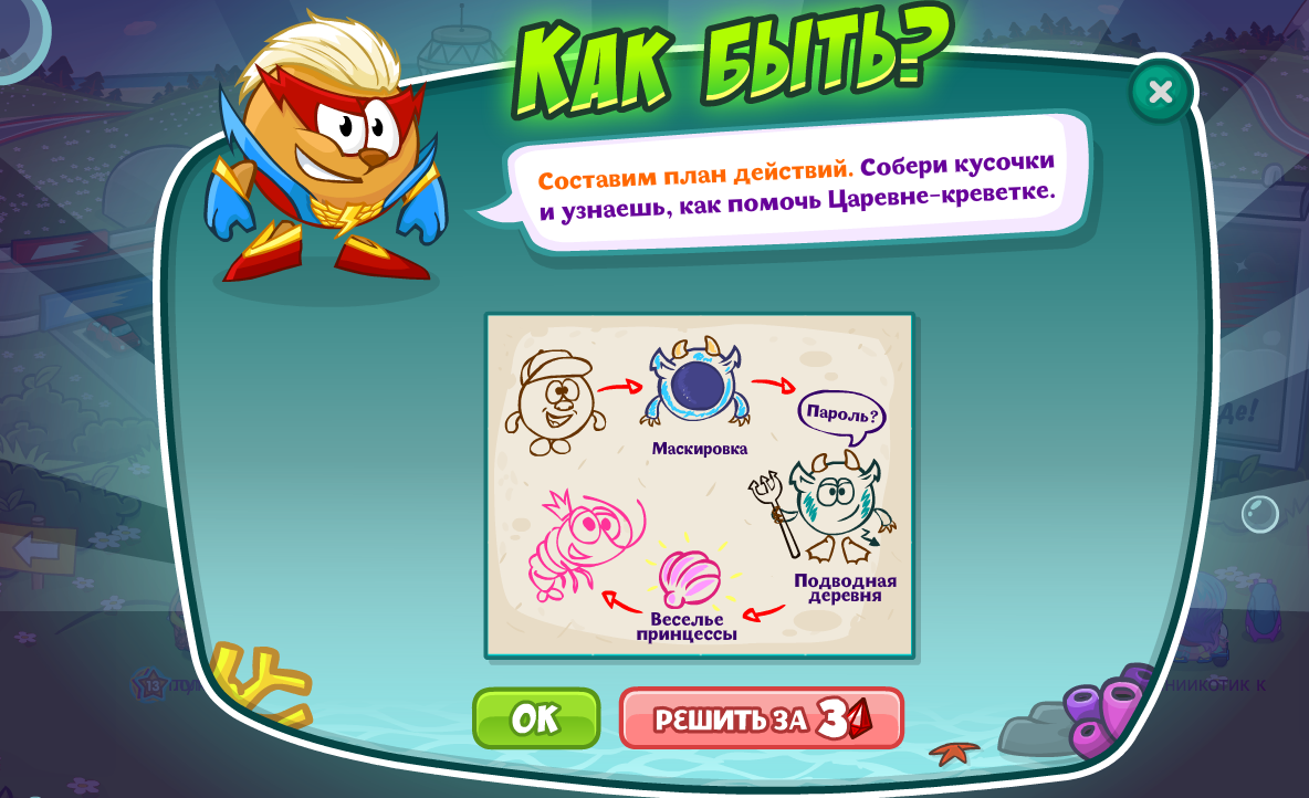 Моя дочка, Царевна-креветка, рыдает без остановки! Это всё Морские чертенята! Они терпеть не могут, когда кто-то веселится! Верни моей дочке радость, а в награду я дам тебе полцарства или коня!