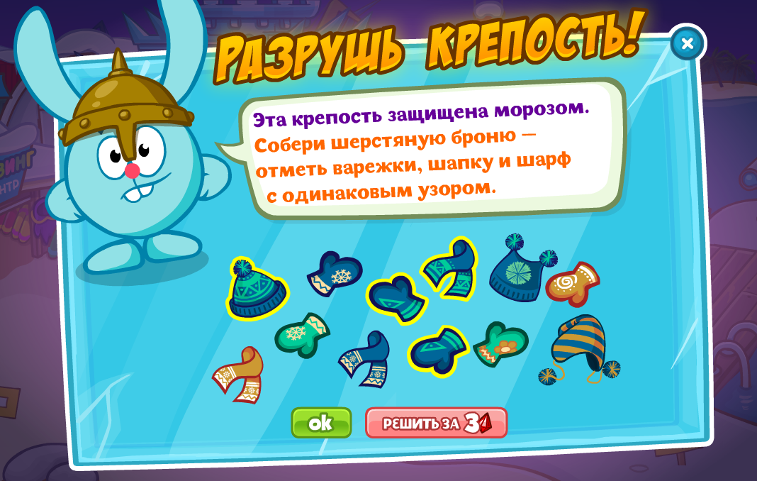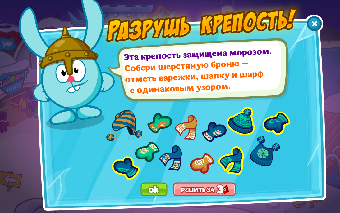Эта крепость защищена морозом. Собери шерстяную броню — отметь варежки, шапку и шарф с одинаковым узором.