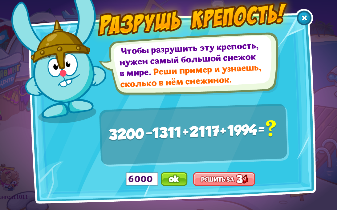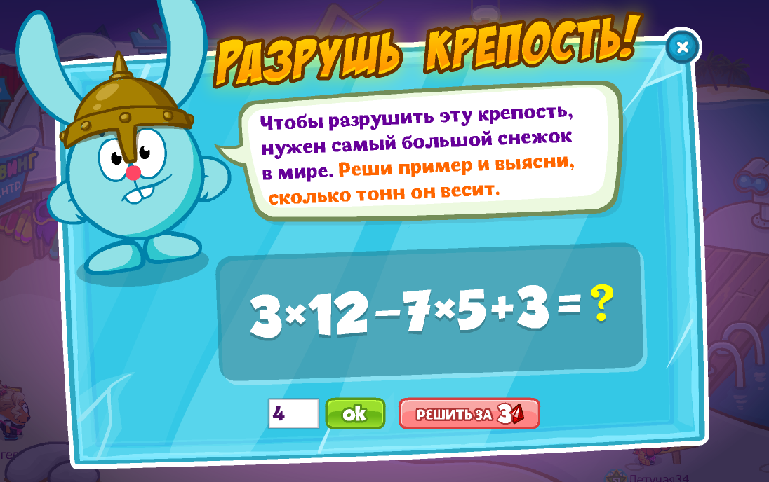 Чтобы разрушить эту крепость, нужен самый большой снежок в мире. Реши пример и узнаешь, сколько в нём снежинок.