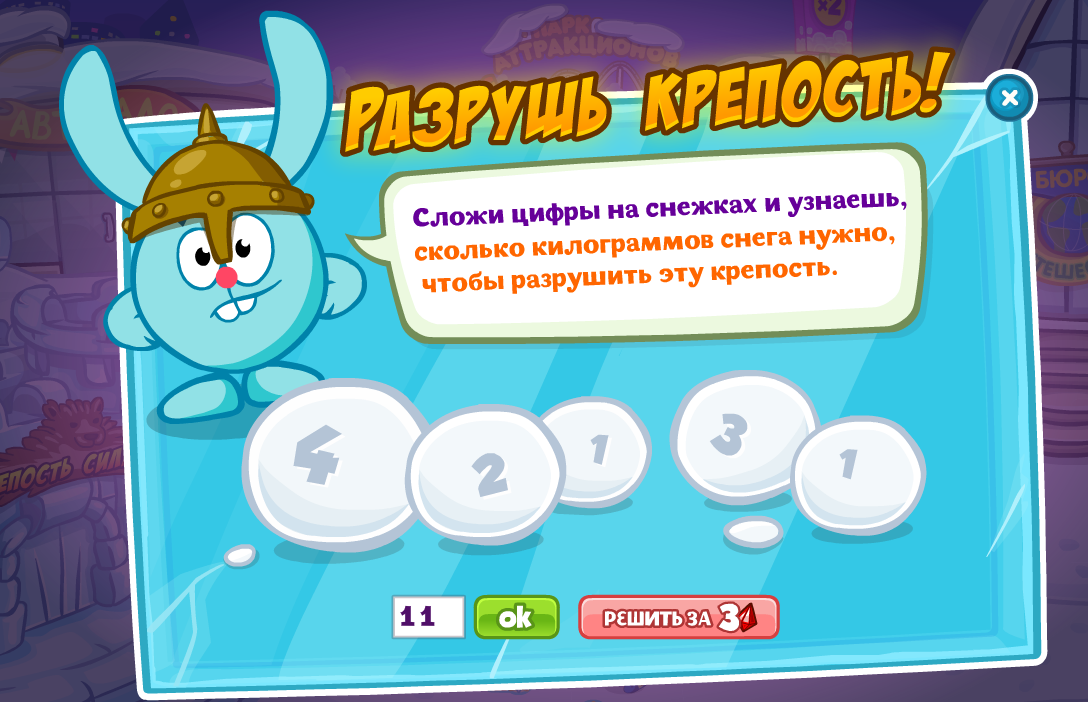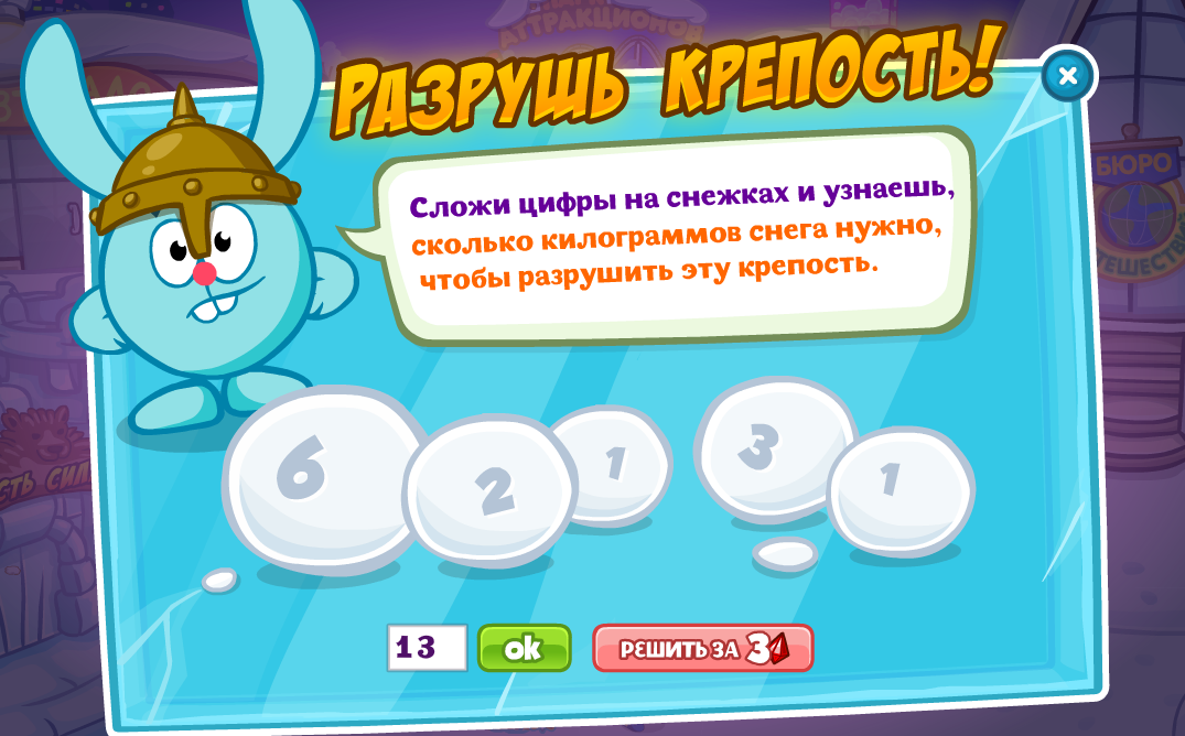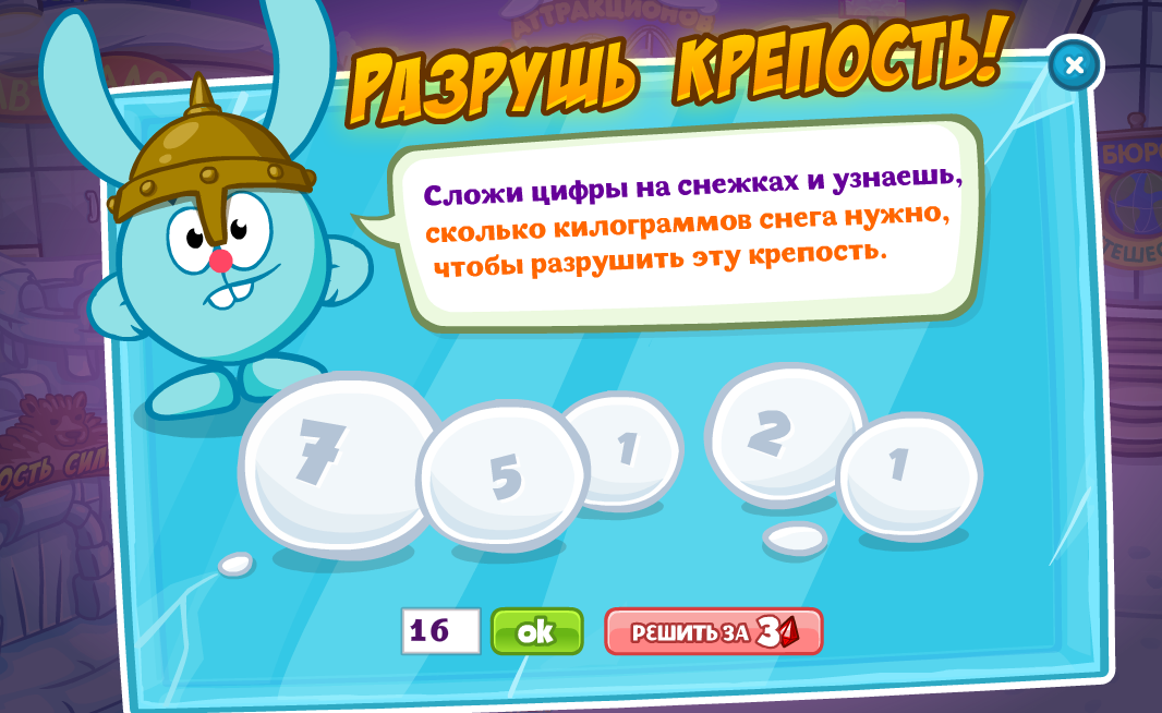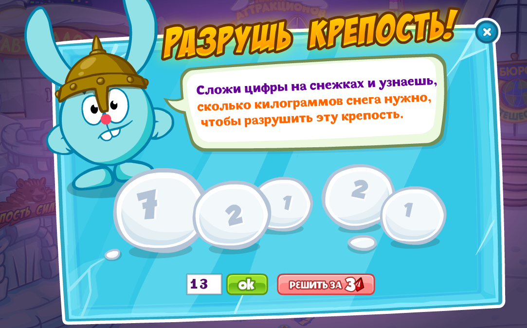 Сложи цифры на снежках и узнаешь, сколько килограммов снега нужно, чтобы разрушить эту крепость.